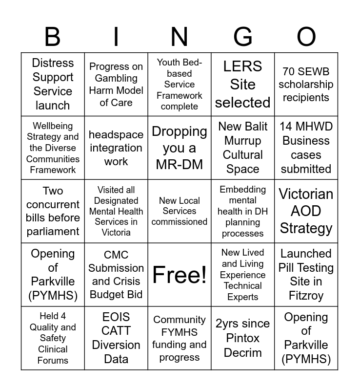 This bingo card has 26 words: Free!, 2yrs since Pintox Decrim, Dropping you a MR-DM, EOIS CATT Diversion Data, 70 SEWB scholarship recipients, Distress Support Service launch, Wellbeing Strategy and the Diverse Communities Framework, Progress on Gambling Harm Model of Care, Victorian AOD Strategy, New Lived and Living Experience Technical Experts, New Balit Murrup Cultural Space, Two concurrent bills before parliament, Launched Pill Testing Site in Fitzroy, Held 4 Quality and Safety Clinical Forums, Visited all Designated Mental Health Services in Victoria, Published Seclusion and Restraint Report 2020–24, LERS Site selected, Opening of Parkville (PYMHS), Youth Bed-based Service Framework complete, New Local Services commissioned, 14 MHWD Business cases submitted, Community FYMHS funding and progress, Embedding mental health in DH planning processes, CMC Submission and Crisis Budget Bid, headspace integration work and Opening of Parkville (PYMHS).