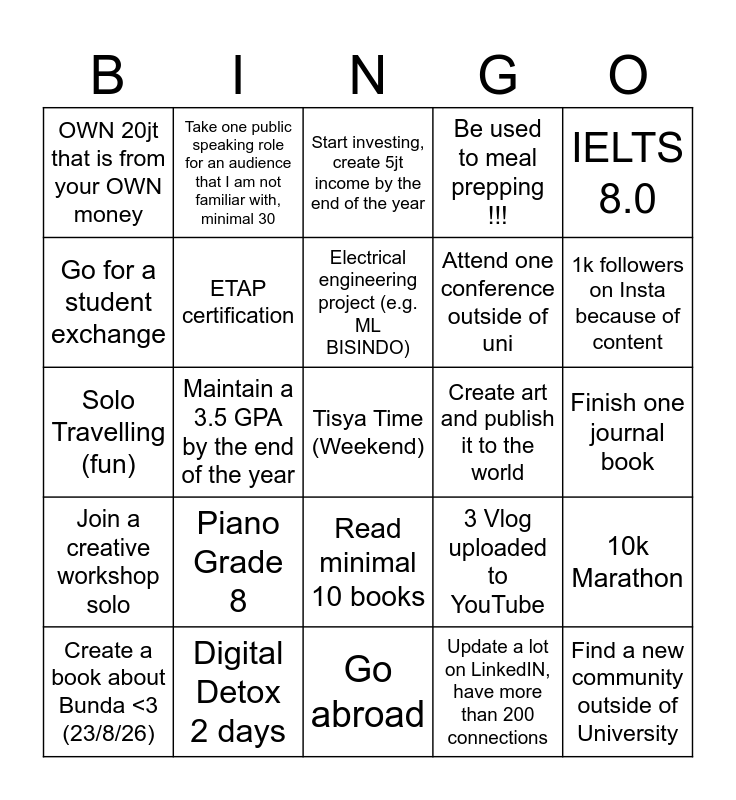This bingo card has a free space and 24 words: Piano Grade 8, Digital Detox 2 days, Electrical engineering project (e.g. ML BISINDO), Create a book about Bunda <3 (23/8/26), IELTS 8.0, OWN 20jt that is from your OWN money, Go for a student exchange, Take one public speaking role for an audience that I am not familiar with, minimal 30, Create art and publish it to the world, Read minimal 10 books, Attend one conference outside of uni, Solo Travelling (fun), 3 Vlog uploaded to YouTube, 10k Marathon, ETAP certification, Update a lot on LinkedIN, have more than 200 connections, Finish one journal book, Start investing, create 5jt income by the end of the year, 1k followers on Insta because of content, Maintain a 3.5 GPA by the end of the year, Find a new community outside of University, Join a creative workshop solo, Be used to meal prepping !!! and Go abroad.