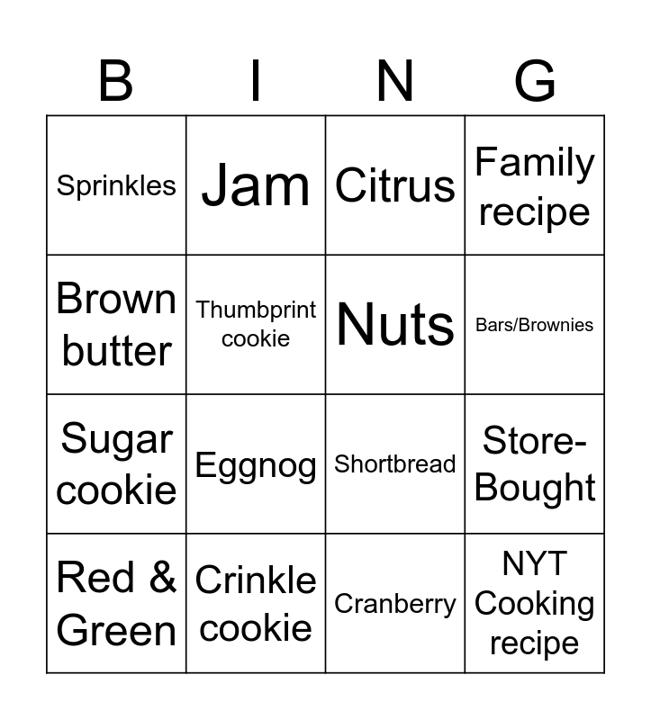 This bingo card has 24 words: Peanut butter cookies, Peppermint, Bars/Brownies, Ginger cookies, Brown butter, Sprinkles, Thumbprint cookie, Jam, Crinkle cookie, Free!, Sugar cookie, Shortbread, No-bake, Caramel, Nuts, Linzers, Cranberry, Citrus, Eggnog, Store-Bought, Red & Green, NYT Cooking recipe, Family recipe and Tea/Matcha.