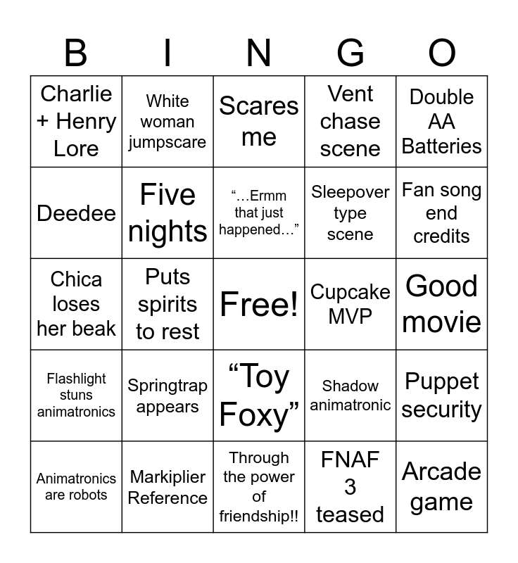 This bingo card has a free space and 24 words: Springtrap appears, Markiplier Reference, “…Ermm that just happened…”, Animatronics are robots, Double AA Batteries, Charlie + Henry Lore, Deedee, White woman jumpscare, Cupcake MVP, “Toy Foxy”, Sleepover type scene, Chica loses her beak, Shadow animatronic, Puppet security, Five nights, FNAF 3 teased, Good movie, Scares me, Fan song end credits, Puts spirits to rest, Arcade game, Flashlight stuns animatronics, Vent chase scene and Through the power of friendship!!.