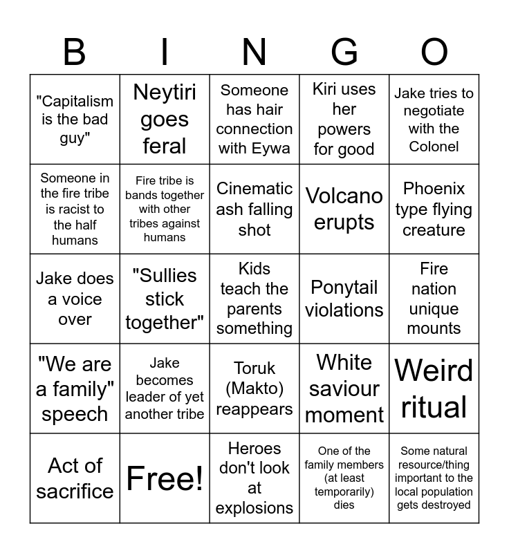 This bingo card has 28 words: Weird ritual, Same enemy from last movie, Volcano erupts, One of the family members (at least temporarily) dies, Someone in the fire tribe is racist to the half humans, Someone has hair connection with Eywa, Neytiri goes feral, "We are a family" speech, Ponytail violations, Act of sacrifice, Jake does a voice over, Kiri uses her powers for good, Free!, Heroes don't look at explosions, Phoenix type flying creature, Forbidden romance (fire nation w/ Sully kid or equivalent), Jake becomes leader of yet another tribe, Fire tribe is bands together with other tribes against humans, Cinematic ash falling shot, Toruk (Makto) reappears, "Capitalism is the bad guy", Some natural resource/thing important to the local population gets destroyed, Kids teach the parents something, "Sullies stick together", Fire nation unique mounts, White saviour moment, Jake tries to negotiate with the Colonel and "They're learning the way of the fire".