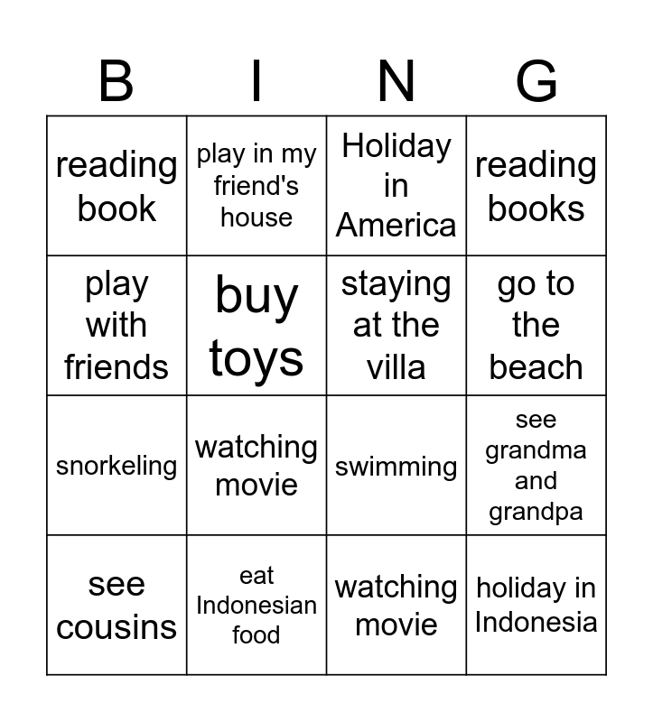 This bingo card has 23 words: holiday in Indonesia, see grandma and grandpa, go to the beach, holiday in America, play with friends, reading book, buy toys, play in my friend's house, see cousins, holiday in Europe, watching movie, snorkeling, swimming, go by plane, eat Indonesian food, speak some Indonesia words, Holiday in America, swimming, staying at the villa, see grandma and grandpa, reading books, watching movie and go to the beach.