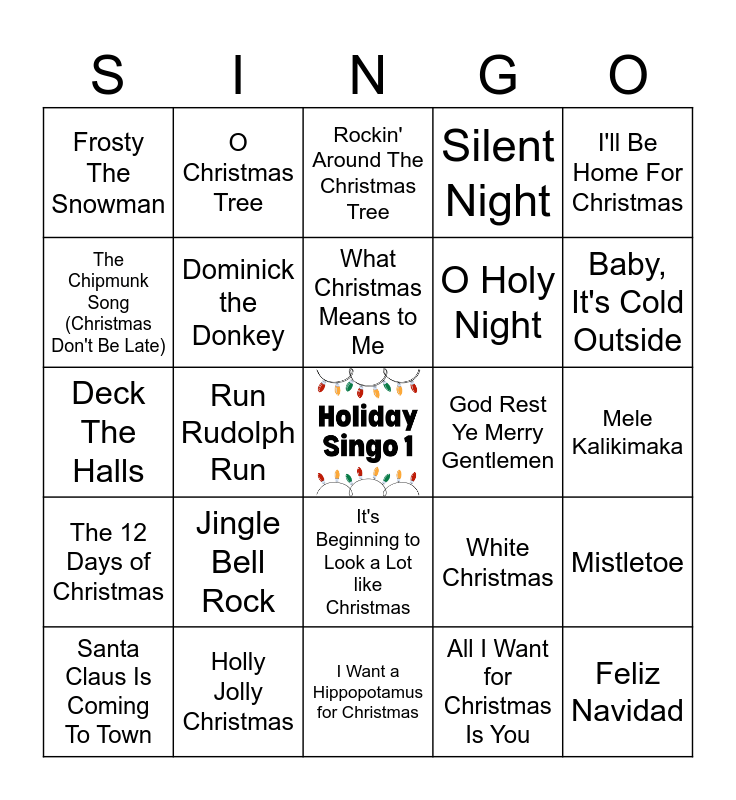 This bingo card has a free space and 44 words: Rudolph the Red-Nosed Reindeer, Feliz Navidad, Please Come Home for Christmas, Santa Claus Is Coming To Town, Sleigh Ride, All I Want for Christmas Is You, Rockin' Around The Christmas Tree, Santa Baby, I'll Be Home For Christmas, Holly Jolly Christmas, Silent Night, God Rest Ye Merry Gentlemen, It's Beginning to Look a Lot like Christmas, Jingle Bell Rock, Grandma Got Run over by a Reindeer, I Want a Hippopotamus for Christmas, You're A Mean One, Mr. Grinch, Deck The Halls, Dance of the Sugar Plum Fairy, Baby, It's Cold Outside, O Christmas Tree, Winter Wonderland, The Little Drummer Boy, Frosty The Snowman, Do You Hear What I Hear?, Mele Kalikimaka, Up On The House-Top, Blue Christmas, White Christmas, The 12 Days of Christmas, I Saw Mommy Kissing Santa Claus, Mistletoe, Have Yourself A Merry Little Christmas, Christmas (Baby Please Come Home), Run Rudolph Run, It's the Most Wonderful Time of the Year, Hark! The Herald Angels Sing, Last Christmas, What Christmas Means to Me, The Chipmunk Song (Christmas Don't Be Late), O Holy Night, March of the Wooden Soldiers, Dominick the Donkey and Step into Christmas.