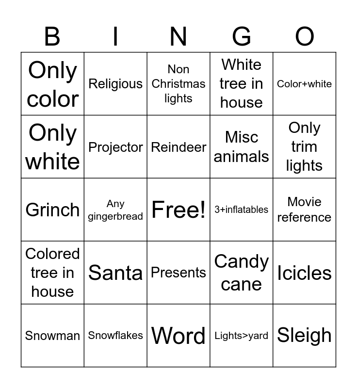 This bingo card has a free space and 24 words: Santa, Snowflakes, Reindeer, Snowman, Color+white, Only color, Only white, Religious, 3+inflatables, Presents, Misc animals, Grinch, Candy cane, Icicles, Projector, Lights>yard, Movie reference, Non Christmas lights, Only trim lights, Any gingerbread, Sleigh, Colored tree in house, White tree in house and Word.