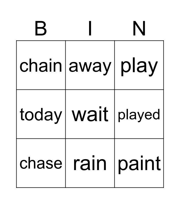 This bingo card has a free space and 8 words: played, play, away, chase, chain, paint, today and rain.