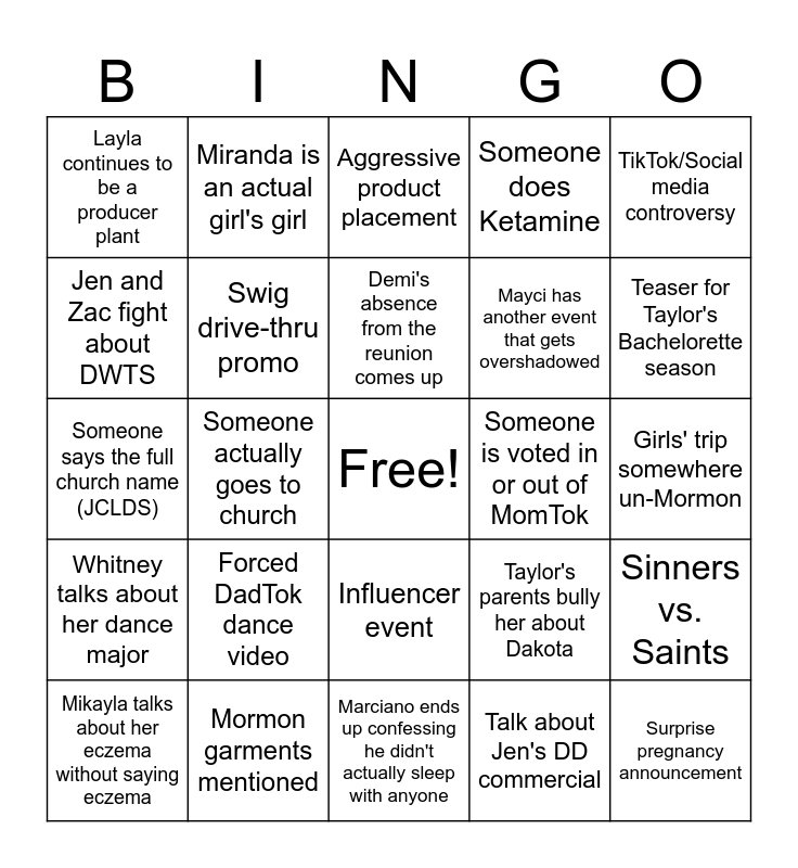This bingo card has a free space and 24 words: Forced DadTok dance video, Mormon garments mentioned, Demi's absence from the reunion comes up, Mikayla talks about her eczema without saying eczema, TikTok/Social media controversy, Layla continues to be a producer plant, Jen and Zac fight about DWTS, Miranda is an actual girl's girl, Someone is voted in or out of MomTok, Influencer event, Mayci has another event that gets overshadowed, Someone says the full church name (JCLDS), Taylor's parents bully her about Dakota, Sinners vs. Saints, Swig drive-thru promo, Talk about Jen's DD commercial, Girls' trip somewhere un-Mormon, Aggressive product placement, Teaser for Taylor's Bachelorette season, Someone actually goes to church, Surprise pregnancy announcement, Whitney talks about her dance major, Someone does Ketamine and Marciano ends up confessing he didn't actually sleep with anyone.