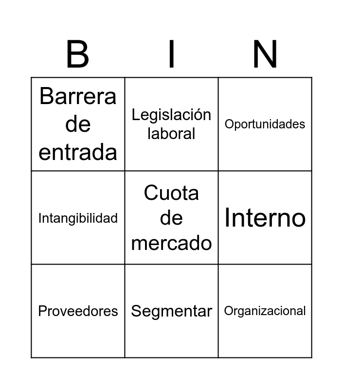 This bingo card has a free space and 8 words: Interno, Oportunidades, Legislación laboral, Proveedores, Barrera de entrada, Organizacional, Intangibilidad and Segmentar.