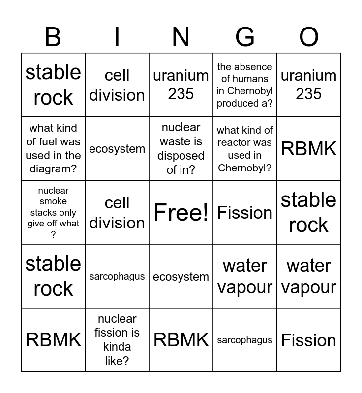 This bingo card has a free space and 31 words: RBMK, sarcophagus, cell division, water vapour, stable rock, uranium 235, ecosystem, water vapour, Fission, sarcophagus, stable rock, Fission, uranium 235, ecosystem, RBMK, Cell division, water vapour, sarcophagus, stable rock, ecosystem, uranium 235, Fission, RBMK, cell division, what kind of reactor was used in Chernobyl?, what kind of fuel was used in the diagram?, the absence of humans in Chernobyl produced a?, nuclear smoke stacks only give off what ?, nuclear fission is kinda like?, nuclear waste is disposed of in? and the covering of Chernobyl is called the ?.