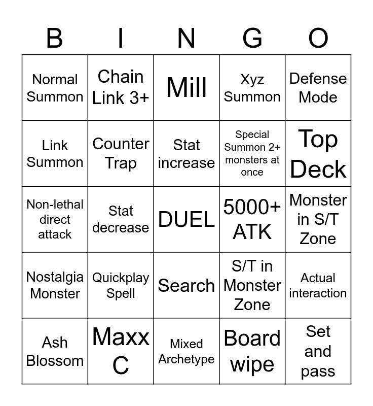 This bingo card has a free space and 54 words: Handtrap, Nostalgia Monster, Surrender before Turn 2, Damage before Turn 2, Search, Synchro Summon, Xyz Summon, Fusion Summon, Link Summon, Extra Deck Summon, Normal Summon, Special Summons 5+ monsters, Maxx C, Ash Blossom, Multiple Extra Deck types, Mixed Archetype, Set and pass, Special Summon 2+ monsters at once, Steals opponents card, Monster in S/T Zone, S/T in Monster Zone, Banished card, 5000+ ATK, Defense Mode, 0 ATK summon, Chain Link 3+, Activate in GY, Return to hand, OG card played, Board wipe, 3+ cards destroyed at once, S/T zone wipe, Monster zone wipe, Destroy own card, Mill, Attack into stronger monster, Non-lethal direct attack, Actual interaction, Negate, Counter Trap, Field Spell, Continuous Trap, Equip Spell, Continuous Spell, Quickplay Spell, 3+ material summon, Actual cost, Draw 3+ cards in one turn, Stat increase, Stat decrease, Top Deck, 0 cards in hand, Summon from GY and Solitaire (9+ cards).