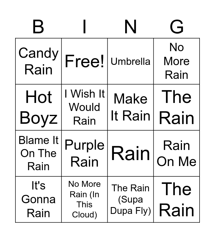 This bingo card has 19 words: Rain, Can You Stand The Rain, Umbrella, The Rain, Rain On Me, Hot Boyz, The Rain (Supa Dupa Fly), Candy Rain, Free!, Blame It On The Rain, Purple Rain, I Wish It Would Rain, Make It Rain, No More Rain (In This Cloud), It's Gonna Rain, Summer Rain, No More Rain, The Rain and Raindance.