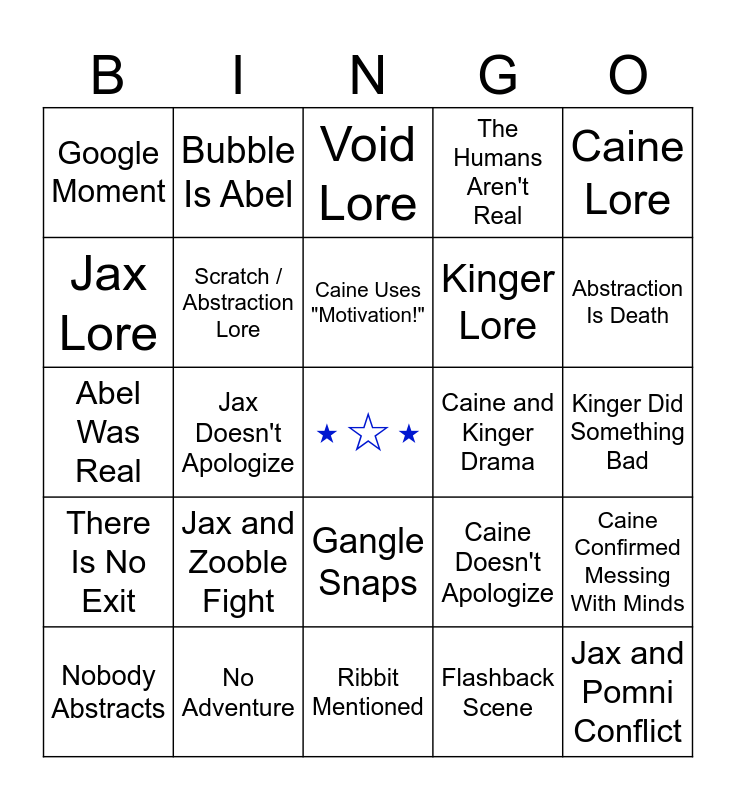 This bingo card has a free space and 24 words: Jax and Zooble Fight, No Adventure, Caine Uses "Motivation!", Nobody Abstracts, Caine Lore, Google Moment, Jax Lore, Bubble Is Abel, Caine and Kinger Drama, Gangle Snaps, Kinger Lore, Abel Was Real, Caine Doesn't Apologize, Caine Confirmed Messing With Minds, Scratch / Abstraction Lore, Flashback Scene, Kinger Did Something Bad, Void Lore, Abstraction Is Death, Jax Doesn't Apologize, Jax and Pomni Conflict, There Is No Exit, The Humans Aren't Real and Ribbit Mentioned.