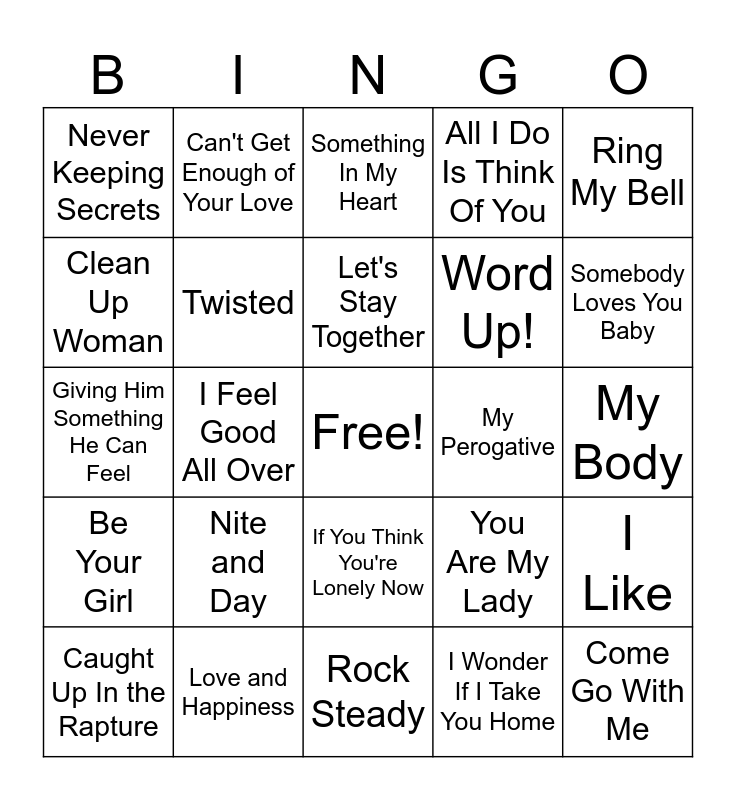 This bingo card has a free space and 24 words: Nite and Day, Love and Happiness, Let's Stay Together, Caught Up In the Rapture, Ring My Bell, Never Keeping Secrets, Clean Up Woman, Can't Get Enough of Your Love, My Perogative, If You Think You're Lonely Now, Word Up!, Giving Him Something He Can Feel, You Are My Lady, I Like, Twisted, I Wonder If I Take You Home, My Body, Something In My Heart, Somebody Loves You Baby, I Feel Good All Over, Come Go With Me, Be Your Girl, All I Do Is Think Of You and Rock Steady.