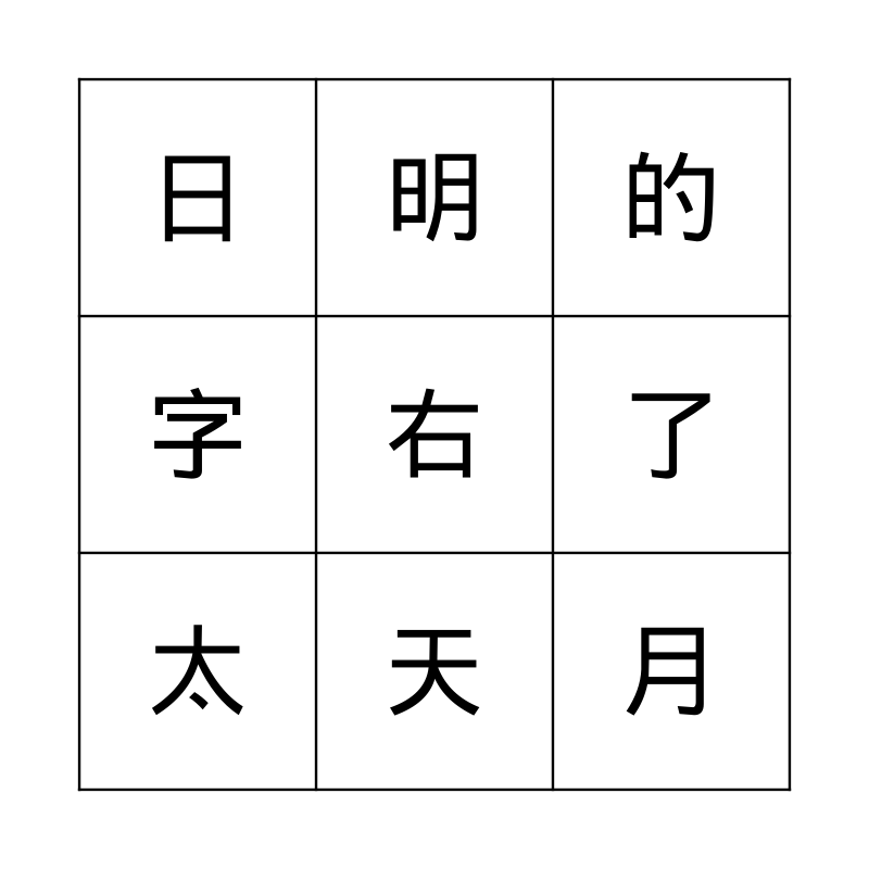 This bingo card has 16 words: 百, 白, 的, 日, 月, 明, 工, 左, 右, 了, 子, 字, 大, 天, 太 and 九.