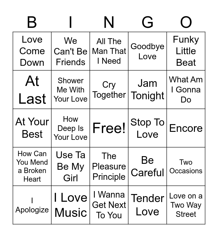 This bingo card has a free space and 24 words: Use Ta Be My Girl, I Love Music, Cry Together, I Apologize, Funky Little Beat, Love Come Down, At Last, We Can't Be Friends, Stop To Love, The Pleasure Principle, Jam Tonight, At Your Best, Be Careful, Two Occasions, Shower Me With Your Love, Tender Love, Encore, All The Man That I Need, What Am I Gonna Do, How Deep Is Your Love, Love on a Two Way Street, How Can You Mend a Broken Heart, Goodbye Love and I Wanna Get Next To You.