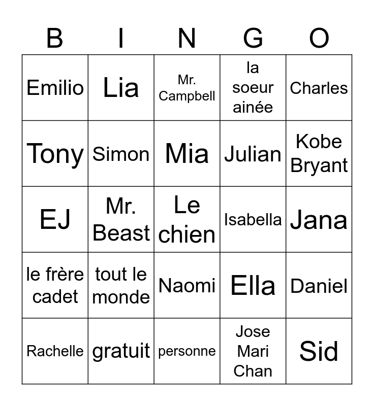 This bingo card has 25 words: tout le monde, personne, Mia, Rachelle, Charles, Emilio, Tony, Lia, Isabella, Naomi, Julian, EJ, Ella, Daniel, Simon, Sid, Jana, Mr. Campbell, Kobe Bryant, Mr. Beast, Le chien, gratuit, le frère cadet, la soeur ainée and Jose Mari Chan.
