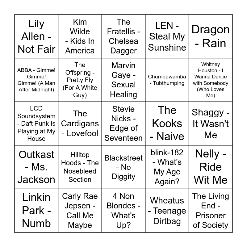 This bingo card has 61 words: Michael Jackson - Don't Stop 'Til You Get Enough, Carly Rae Jepsen - Call Me Maybe, Gorillaz - Clint Eastwood, Outkast - Ms. Jackson, Wheatus - Teenage Dirtbag, Train - Drops of Jupiter (Tell Me), The Offspring - Pretty Fly (For A White Guy), House Of Pain - Jump Around, Chumbawamba - Tubthumping, Mariah Carey - Fantasy, LEN - Steal My Sunshine, Divinyls - I Touch Myself, ABBA - Gimme! Gimme! Gimme! (A Man After Midnight), Kim Carnes - Bette Davis Eyes, Natasha Bedingfield - Unwritten, Lily Allen - Not Fair, Stevie Nicks - Edge of Seventeen, Dragon - Rain, Toploader - Dancing in the Moonlight, Marvin Gaye - Sexual Healing, The Kooks - Naive, The Fratellis - Chelsea Dagger, Linkin Park - Numb, Nelly - Ride Wit Me, Madonna - Like a Prayer, George Michael - Faith, TOTO - Hold the Line, Modjo - Lady - Hear Me Tonight, Whitney Houston - I Wanna Dance with Somebody (Who Loves Me), New Order - Blue Monday '88, iNi Kamoze - Here Comes the Hotstepper - Heartical Mix, Madison Avenue - Don't Call Me Baby, The Supermen Lovers - Starlight, Garbage - Cherry Lips (Go Baby Go!), Kim Wilde - Kids In America, Hot Chocolate - You Sexy Thing, Sir Mix-A-Lot - Baby Got Back, The Cardigans - Lovefool, Bodyrockers - I Like The Way, LCD Soundsystem - Daft Punk Is Playing at My House, Dire Straits - Walk Of Life, Hilltop Hoods - The Nosebleed Section, Shaggy - It Wasn't Me, Dolly Parton - Islands in the Stream, blink-182 - What's My Age Again?, Third Eye Blind - Semi-Charmed Life, Frankie Valli - Can't Take My Eyes off You, Wilson Phillips - Hold On, The Goo Goo Dolls - Slide, Blackstreet - No Diggity, 4 Non Blondes - What's Up?, Violent Femmes - Blister In The Sun, Young MC - Bust A Move, Talking Heads - Burning Down the House, Supergrass - Alright, The Killers - Somebody Told Me, Eddy Grant - Electric Avenue, The Angels - Am I Ever Gonna See Your Face Again (Original Single), Dragon - April Sun in Cuba, The Living End - Prisoner of Society and Wham! - Last Christmas.