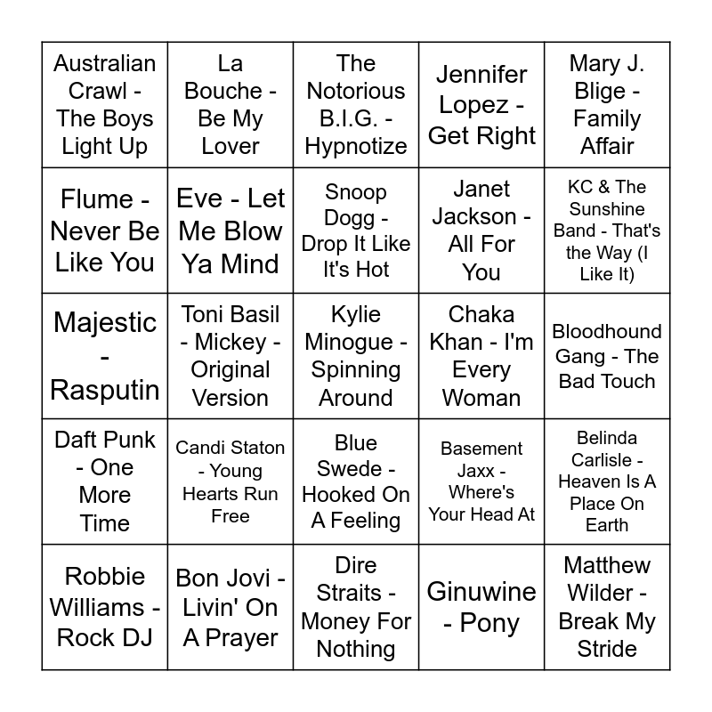 This bingo card has 61 words: Bee Gees - Stayin' Alive, Bon Jovi - Livin' On A Prayer, Missy Elliott - Work It, Daft Punk - One More Time, Ginuwine - Pony, Crazy Town - Butterfly, Eve - Let Me Blow Ya Mind, Sophie Ellis-Bextor - Murder On The Dancefloor, Janet Jackson - All For You, Black Eyed Peas - Pump It, Jennifer Lopez - Get Right, Fergie - Clumsy, Flume - Never Be Like You, Art vs Science - Parlez Vous Francais, INXS - Need You Tonight, Australian Crawl - The Boys Light Up, Kylie Minogue - Spinning Around, Mary J. Blige - Family Affair, Eminem - Without Me, Snoop Dogg - Drop It Like It's Hot, Chaka Khan - I'm Every Woman, The Notorious B.I.G. - Hypnotize, Robbie Williams - Rock DJ, Belinda Carlisle - Heaven Is A Place On Earth, Dizzee Rascal - Dance Wiv Me, Run–D.M.C. - It's Tricky, Thin Lizzy - The Boys Are Back In Town, Blondie - Heart Of Glass - Remix, KC & The Sunshine Band - That's the Way (I Like It), Stardust - Music Sounds Better With You, Corona - The Rhythm of the Night, Tavares - Heaven Must Be Missing An Angel, Wild Cherry - Play That Funky Music, David Bowie - Golden Years, La Bouche - Be My Lover, Kris Kross - Jump, Bonnie Tyler - Holding Out for a Hero, Toni Basil - Mickey - Original Version, Chappell Roan - HOT TO GO!, Majestic - Rasputin, Fatman Scoop - Be Faithful, Candi Staton - Young Hearts Run Free, Bloodhound Gang - The Bad Touch, Cypress Hill - Insane in the Brain, Basement Jaxx - Where's Your Head At, No Doubt - Hella Good, OMI - Cheerleader, Carl Douglas - Kung Fu Fighting, The Four Seasons - December, 1963 (Oh What a Night!), Blue Swede - Hooked On A Feeling, Dire Straits - Money For Nothing, The All-American Rejects - Dirty Little Secret, Blur - Song 2, Belinda Carlisle - Heaven Is A Place On Earth, Montell Jordan - This Is How We Do It, Beastie Boys - Intergalactic, CAKE - Short Skirt / Long Jacket, RAYE - WHERE IS MY HUSBAND!, Tom Jones - It's Not Unusual, Matthew Wilder - Break My Stride and Charli xcx - Guess featuring billie eilish.