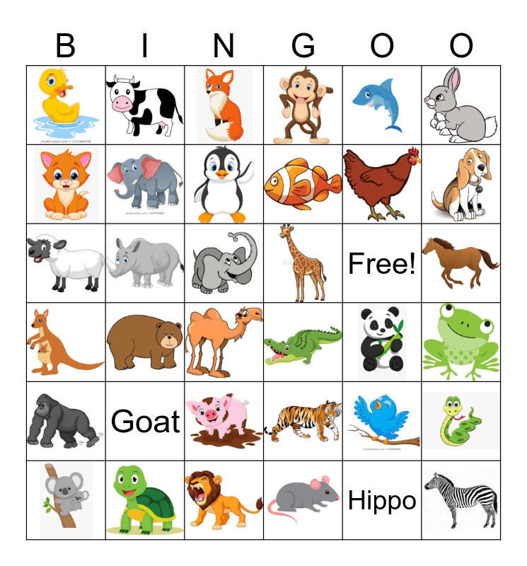 This bingo card has 33 images and 3 words: Free!, Goat and Hippo.