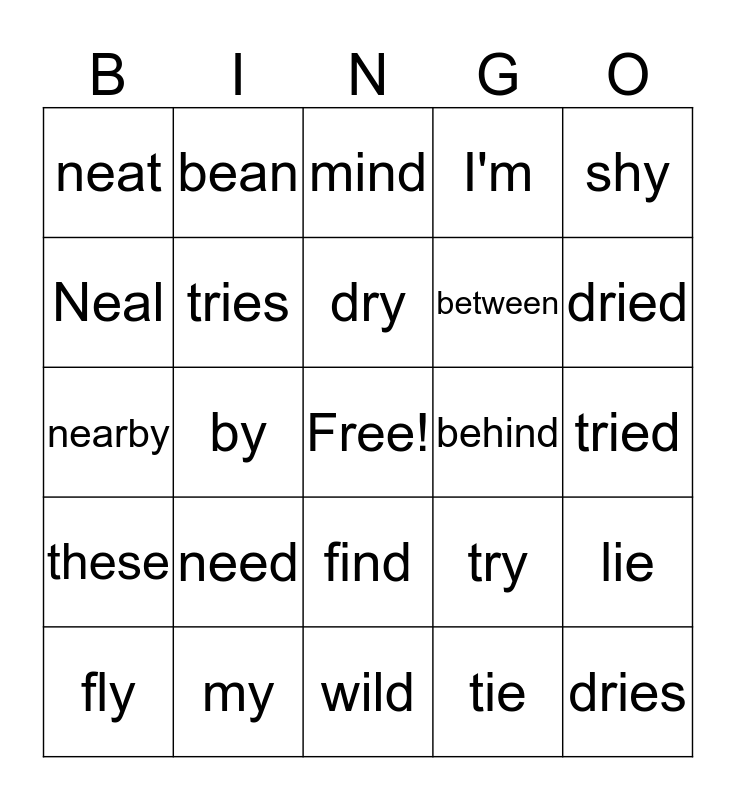 This bingo card has a free space and 24 words: need, my, dry, fly, shy, neat, Neal, bean, behind, find, between, nearby, try, lie, tries, tie, tried, mind, dried, by, dries, these, I'm and wild.