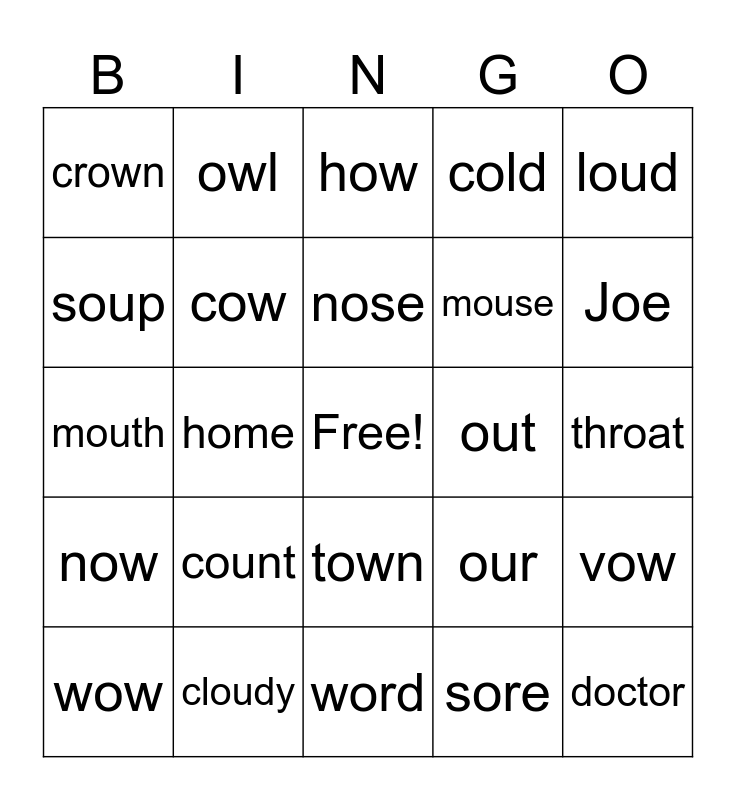 This bingo card has a free space and 24 words: count, cloudy, nose, wow, loud, crown, soup, owl, out, town, mouse, mouth, our, vow, cow, sore, throat, how, Joe, home, doctor, now, cold and word.