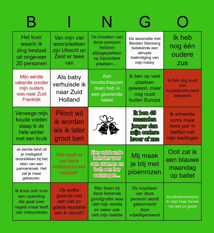 This bingo card has a free space and 24 words: Wie heeft er wel eens hotelpersoneel misleid?, Op welke groente met een niet zo goede reputatie ben ik verzot?, Aan boodschappen doen heb ik een gloeiende hekel, Ik koos ooit voor een opleiding die gaat over regels maar leeft van interpretatie, Ik heb nog één oudere zus, Het koor waarin ik zing bestaat uit ongeveer 20 personen, Mijn eerste vakantie zonder mijn ouders was naar Zuid Frankrijk, Van mijn vier woonplaatsen zijn Utrecht en Zeist er twee van, Ik ben 49 maanden jonger dan mijn oudere broer of zus, Een voldoende behalen voor een examen en toch een her aanvragen..., Ik ben op veel plaatsen geweest, maar nog nooit buiten Europa, Vanwege mijn koude voeten slaap ik de hele winter met een kruik, Mij maak je blij met pioenrozen, Ooit zat ik een blauwe maandag op ballet, Als baby verhuisde ik naar Zuid Holland, De loopbaan van deze persoon wordt gekenmerkt door vrijwilligerswerk, Ik scheelde soms maar twee jaar in leeftijd met mijn leerlingen, De broeken van deze persoon hebben slijtageplekken op bijzondere plaatsen...., Ik heb nog nooit een muziekinstrument bespeeld, Piloot wil ik worden als ik later groot ben, Knoflookshampoo in mijn haar beviel mij niet zo goed, Je eerste tand uit je melkgebit doorslikken bij het eten van een pannenkoek. Het zal je maar gebeuren., De associatie met Berdien Stenberg betekende een abrupte beëindiging van mijn hobby and Mijn baan bij deze bekende grootgrutter was niet mijn eerste en zeker ook niet mijn laatste.