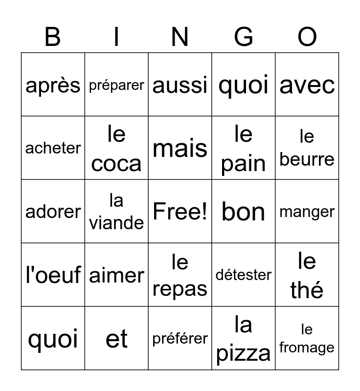 This bingo card has a free space and 24 words: aimer, et, mais, quoi, avec, après, acheter, préparer, bon, le repas, le pain, adorer, détester, le thé, le coca, la pizza, manger, aussi, le beurre, la viande, le fromage, l'oeuf, quoi and préférer.