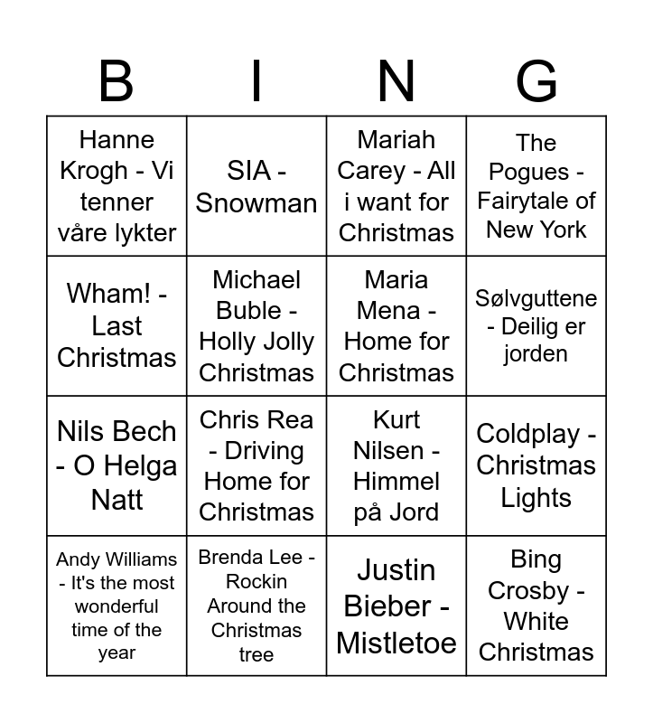This bingo card has 16 words: Brenda Lee - Rockin Around the Christmas tree, Coldplay - Christmas Lights, Mariah Carey - All i want for Christmas, Hanne Krogh - Vi tenner våre lykter, Nils Bech - O Helga Natt, SIA - Snowman, Kurt Nilsen - Himmel på Jord, Justin Bieber - Mistletoe, Wham! - Last Christmas, Michael Buble - Holly Jolly Christmas, Andy Williams - It's the most wonderful time of the year, The Pogues - Fairytale of New York, Chris Rea - Driving Home for Christmas, Sølvguttene - Deilig er jorden, Maria Mena - Home for Christmas and Bing Crosby - White Christmas.