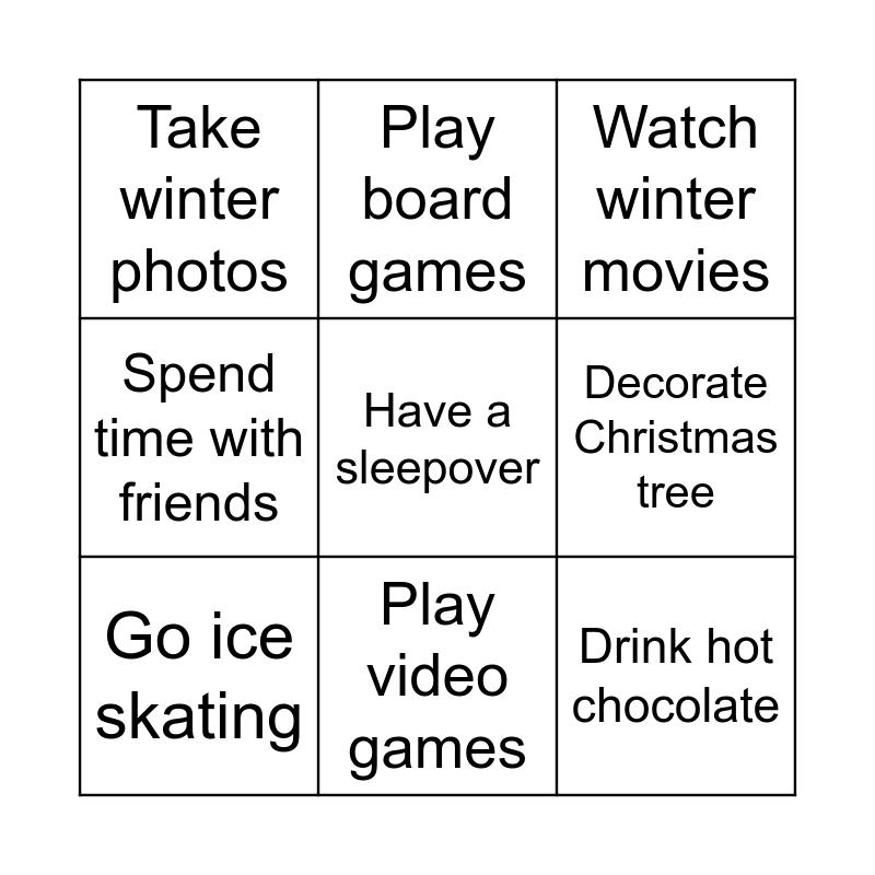 This bingo card has 9 words: Go ice skating, Watch winter movies, Play board games, Spend time with friends, Take winter photos, Decorate Christmas tree, Have a sleepover, Drink hot chocolate and Play video games.