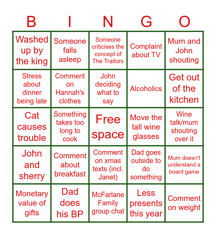 This bingo card has a free space and 24 words: Comment about breakfast, Dad does his BP, John deciding what to say, Monetary value of gifts, Mum and John shouting, Washed up by the king, Stress about dinner being late, Someone falls asleep, Move the tall wine glasses, Comment on xmas texts (incl. Janet), Alcoholics, Cat causes trouble, Dad goes outside to do something, Mum doesn't understand a board game, Comment on Hannah's clothes, Less presents this year, Wine talk/mum shouting over it, Someone criticises the concept of The Traitors, Get out of the kitchen, Something takes too long to cook, Comment on weight, John and sherry, Complaint about TV and McFarlane Family group chat.