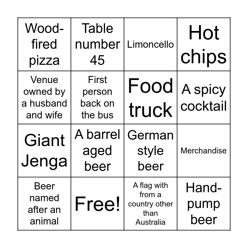 This bingo card has 28 words: Fish on the menu, Cocktail with a punny name, Giant Jenga, Non-Alc option, First person back on the bus, Limoncello, Table number 45, Hand-pump beer, Free!, Corn Hole, German style beer, Hot chips, Beer garden, Fairy lights, A barrel aged beer, Someone spills a drink, AC/DC song, Food truck, A spicy cocktail, Tasting paddle, Wood-fired pizza, Someone tells you about their home brew, Beer named after an animal, Merchandise, A flag with from a country other than Australia, Venue with a view, Venue owned by a husband and wife and Bartender named Dave.