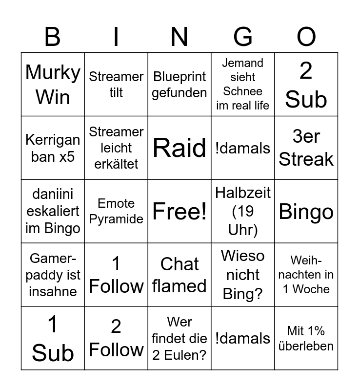 This bingo card has a free space and 24 words: 1 Follow, 2 Follow, Raid, 1 Sub, 2 Sub, Murky Win, Kerrigan ban x5, Streamer tilt, Halbzeit (19 Uhr), Chat flamed, !damals, daniini eskaliert im Bingo, Wieso nicht Bing?, Weih-nachten in 1 Woche, Streamer leicht erkältet, !damals, Bingo, Blueprint gefunden, 3er Streak, Emote Pyramide, Mit 1% überleben, Gamer-paddy ist insahne, Jemand sieht Schnee im real life and Wer findet die 2 Eulen?.