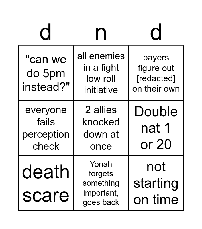 This bingo card has a free space and 8 words: Double nat 1 or 20, payers figure out [redacted] on their own, all enemies in a fight low roll initiative, death scare, "can we do 5pm instead?", not starting on time, everyone fails perception check and Yonah forgets something important, goes back.