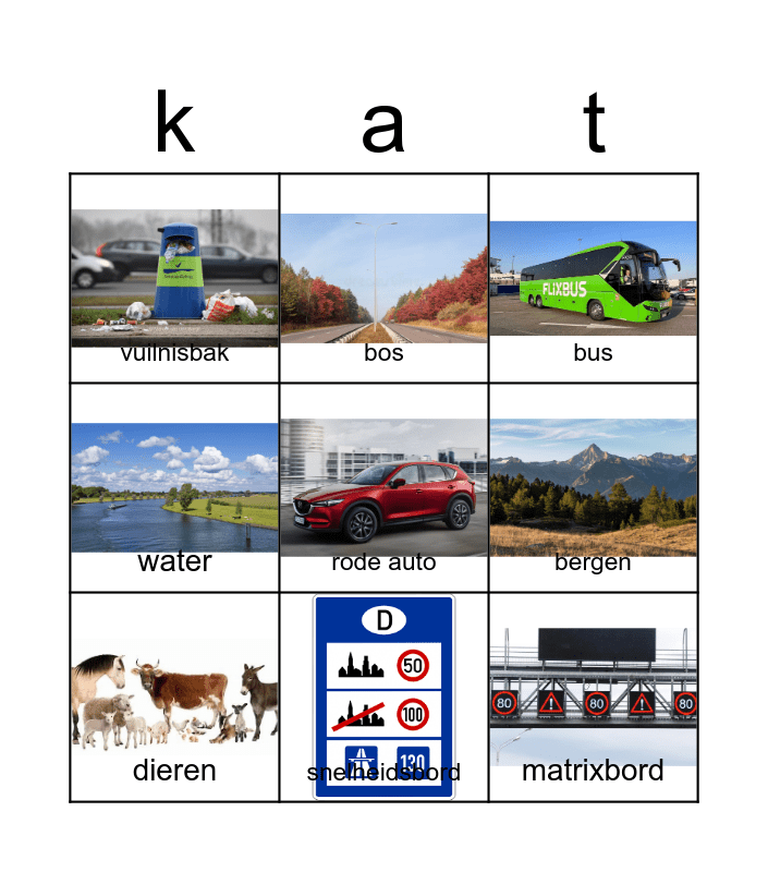 This bingo card has 8 images, a free space and 8 words: bergen, bus, bos, dieren, vuilnisbak, matrixbord, water and snelheidsbord.