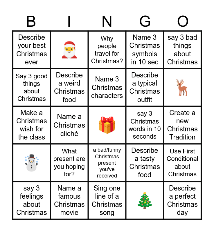 This bingo card has a free space and 24 words: say 3 feelings about Christmas, What present are you hoping for?, Name 3 Christmas characters, 🎄, say 3 bad things about Christmas, Describe your best Christmas ever, 🎅, Why people travel for Christmas?, say 3 Christmas words in 10 seconds, Create a new Christmas Tradition, Make a Christmas wish for the class, Describe a weird Christmas food, Describe a tasty Christmas food, Use First Conditional about Christmas, Say 3 good things about Christmas, Name a famous Christmas movie, Sing one line of a Christmas song, Name 3 Christmas symbols in 10 sec, 🦌, ☃️, Name a Christmas cliché, a bad/funny Christmas present you've received, Describe a typical Christmas outfit and Describe a perfect Christmas day.