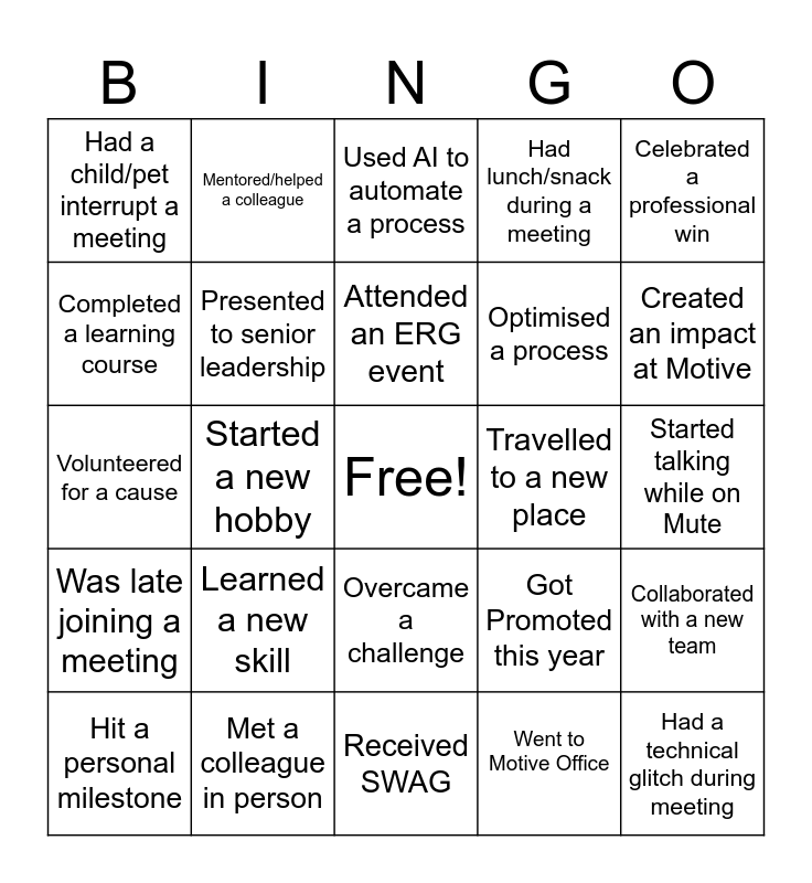 This bingo card has a free space and 24 words: Learned a new skill, Met a colleague in person, Attended an ERG event, Hit a personal milestone, Celebrated a professional win, Had a child/pet interrupt a meeting, Completed a learning course, Mentored/helped a colleague, Travelled to a new place, Overcame a challenge, Optimised a process, Volunteered for a cause, Got Promoted this year, Collaborated with a new team, Presented to senior leadership, Went to Motive Office, Started talking while on Mute, Used AI to automate a process, Created an impact at Motive, Started a new hobby, Had a technical glitch during meeting, Was late joining a meeting, Had lunch/snack during a meeting and Received SWAG.