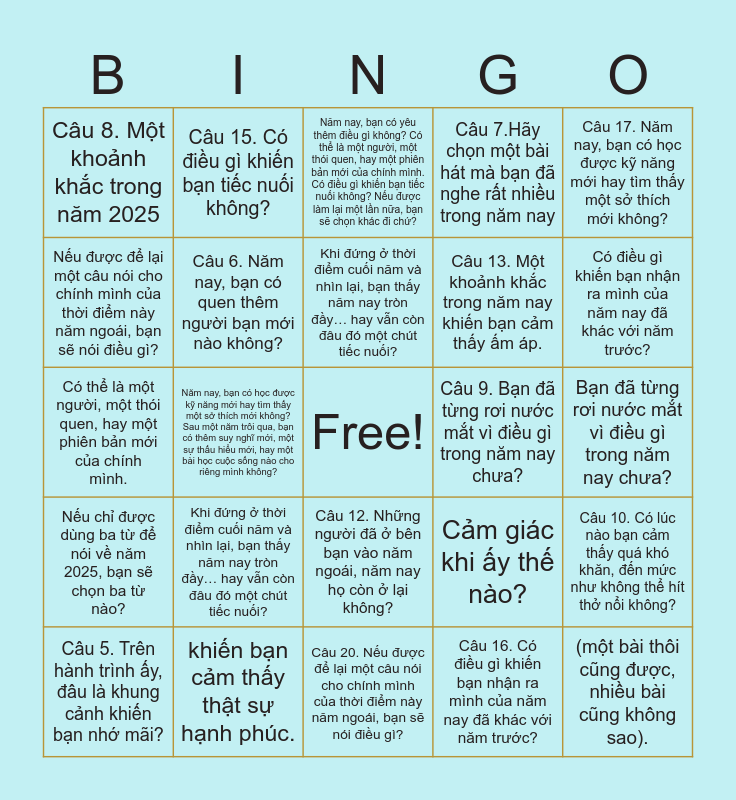 This bingo card has a free space and 45 words: Nếu chỉ được dùng ba từ để nói về năm 2025, bạn sẽ chọn ba từ nào?, Khi đứng ở thời điểm cuối năm và nhìn lại, bạn thấy năm nay tròn đầy… hay vẫn còn đâu đó một chút tiếc nuối?, Năm nay, bạn có thử làm điều gì mà trước đây chưa từng dám làm không?, Cảm giác khi ấy thế nào?, Câu 4. Bạn đã đặt chân đến những nơi mới chưa – một không gian, một thành phố, hay một đất nước mà trước đây bạn chưa từng đi qua?, Câu 5. Trên hành trình ấy, đâu là khung cảnh khiến bạn nhớ mãi?, Câu 6. Năm nay, bạn có quen thêm người bạn mới nào không?, Và hai bạn đã trở thành bạn bè bằng cách nào?, Câu 7.Hãy chọn một bài hát mà bạn đã nghe rất nhiều trong năm nay, (một bài thôi cũng được, nhiều bài cũng không sao)., Câu 8. Một khoảnh khắc trong năm 2025, khiến bạn cảm thấy thật sự hạnh phúc., Câu 9. Bạn đã từng rơi nước mắt vì điều gì trong năm nay chưa?, Câu 10. Có lúc nào bạn cảm thấy quá khó khăn, đến mức như không thể hít thở nổi không?, Bây giờ, bạn đã bước ra khỏi thời điểm đó chưa?, Câu 11. Nếu được quay lại, bạn muốn nói gì với chính mình của khi ấy?, Câu 12. Những người đã ở bên bạn vào năm ngoái, năm nay họ còn ở lại không?, Câu 13. Một khoảnh khắc trong năm nay khiến bạn cảm thấy ấm áp., Câu 14. Năm nay, bạn có yêu thêm điều gì không?, Có thể là một người, một thói quen, hay một phiên bản mới của chính mình., Câu 15. Có điều gì khiến bạn tiếc nuối không?, Nếu được làm lại một lần nữa, bạn sẽ chọn khác đi chứ?, Câu 16. Có điều gì khiến bạn nhận ra mình của năm nay đã khác với năm trước?, Câu 17. Năm nay, bạn có học được kỹ năng mới hay tìm thấy một sở thích mới không?, Câu 18. Sau một năm trôi qua, bạn có thêm suy nghĩ mới, một sự thấu hiểu mới, hay một bài học cuộc sống nào cho riêng mình không?, Câu 19.Trong năm nay, có cuốn sách, bộ phim hay bộ phim truyền hình nào khiến bạn đặc biệt yêu thích không?, Câu 20. Nếu được để lại một câu nói cho chính mình của thời điểm này năm ngoái, bạn sẽ nói điều gì?, Câu 21. Nếu chỉ được chọn một điều, bạn muốn nhất định làm được điều gì trong năm 2026?, Nếu chỉ được dùng ba từ để nói về năm 2025, bạn sẽ chọn ba từ nào?, Khi đứng ở thời điểm cuối năm và nhìn lại, bạn thấy năm nay tròn đầy… hay vẫn còn đâu đó một chút tiếc nuối?, Năm nay, bạn có thử làm điều gì mà trước đây chưa từng dám làm không? Cảm giác khi ấy thế nào?, Bạn đã đặt chân đến những nơi mới chưa – một không gian, một thành phố, hay một đất nước mà trước đây bạn chưa từng đi qua?Trên hành trình ấy, đâu là khung cảnh khiến bạn nhớ mãi?, Năm nay, bạn có quen thêm người bạn mới nào không? Và hai bạn đã trở thành bạn bè bằng cách nào?, Hãy chọn một bài hát mà bạn đã nghe rất nhiều trong năm nay (một bài thôi cũng được, nhiều bài cũng không sao)., Một khoảnh khắc trong năm 2025 khiến bạn cảm thấy thật sự hạnh phúc., Bạn đã từng rơi nước mắt vì điều gì trong năm nay chưa?, Có lúc nào bạn cảm thấy quá khó khăn, đến mức như không thể hít thở nổi không? Bây giờ, bạn đã bước ra khỏi thời điểm đó chưa? Nếu được quay lại, bạn muốn nói gì với chính mình của khi ấy?, Những người đã ở bên bạn vào năm ngoái, năm nay họ còn ở lại không?, Một khoảnh khắc trong năm nay khiến bạn cảm thấy ấm áp., Năm nay, bạn có yêu thêm điều gì không? Có thể là một người, một thói quen, hay một phiên bản mới của chính mình. Có điều gì khiến bạn tiếc nuối không? Nếu được làm lại một lần nữa, bạn sẽ chọn khác đi chứ?, Có điều gì khiến bạn nhận ra mình của năm nay đã khác với năm trước?, Năm nay, bạn có học được kỹ năng mới hay tìm thấy một sở thích mới không? Sau một năm trôi qua, bạn có thêm suy nghĩ mới, một sự thấu hiểu mới, hay một bài học cuộc sống nào cho riêng mình không?, Trong năm nay, có cuốn sách, bộ phim hay bộ phim truyền hình nào khiến bạn đặc biệt yêu thích không?, Nếu được để lại một câu nói cho chính mình của thời điểm này năm ngoái, bạn sẽ nói điều gì? and Nếu chỉ được chọn một điều, bạn muốn nhất định làm được điều gì trong năm 2026?.