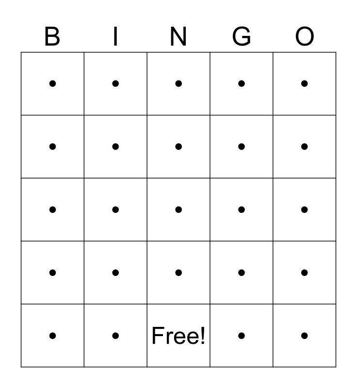 This bingo card has 31 words: Free!, •, •, •, •, •, •, •, •, •, •, •, •, •, •, •, •, •, •, •, •, •, •, •, •, •, •, •, •, • and •.