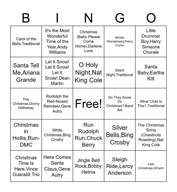 This bingo card has a free space and 50 words: All I Want for Christmas Is You,Mariah Carey, Last Christmas,Wham!, Rockin' Around the Christmas Tree,Brenda Lee, Jingle Bell Rock,Bobby Helms, White Christmas,Bing Crosby, Feliz Navidad,José Feliciano, It's the Most Wonderful Time of the Year,Andy Williams, Underneath the Tree,Kelly Clarkson, Santa Tell Me,Ariana Grande, Holly Jolly Christmas,Burl Ives, Let It Snow! Let It Snow! Let It Snow!,Dean Martin, Winter Wonderland,Perry Como, The Christmas Song (Chestnuts Roasting),Nat King Cole, Silver Bells,Bing Crosby, Frosty the Snowman,Gene Autry, Joy to the World,Traditional, O Holy Night,Nat King Cole, Do They Know It's Christmas?,Band Aid, O Come All Ye Faithful,Traditional, Little Drummer Boy,Harry Simeone Chorale, Rudolph the Red-Nosed Reindeer,Gene Autry, Sleigh Ride,Leroy Anderson, Carol of the Bells,Traditional, Silent Night,Traditional, Deck the Halls,Traditional, It's Beginning to Look a Lot Like Christmas,Bing Crosby, Santa Baby,Eartha Kitt, Little Saint Nick,The Beach Boys, Christmas (Baby Please Come Home),Darlene Love, Run Rudolph Run,Chuck Berry, Wonderful Christmastime,Paul McCartney, Happy Xmas (War Is Over),John Lennon & Yoko Ono, Step Into Christmas,Elton John, Merry Christmas Everyone,Shakin’ Stevens, Here Comes Santa Claus,Gene Autry, The First Noel,Traditional, Angels We Have Heard on High,Traditional, Hark! The Herald Angels Sing,Traditional, O Little Town of Bethlehem,Traditional, What Child Is This?,Traditional, The Twelve Days of Christmas,Traditional, We Wish You a Merry Christmas,Traditional, Jingle Bells,Frank Sinatra, Blue Christmas,Elvis Presley, Christmas Time Is Here,Vince Guaraldi Trio, This Christmas,Donny Hathaway, Grandma Got Run Over by a Reindeer,Elmo & Patsy, Christmas Wrappings,The Waitresses, Christmas in Hollis,Run-DMC and Thank God It's Christmas,Queen.