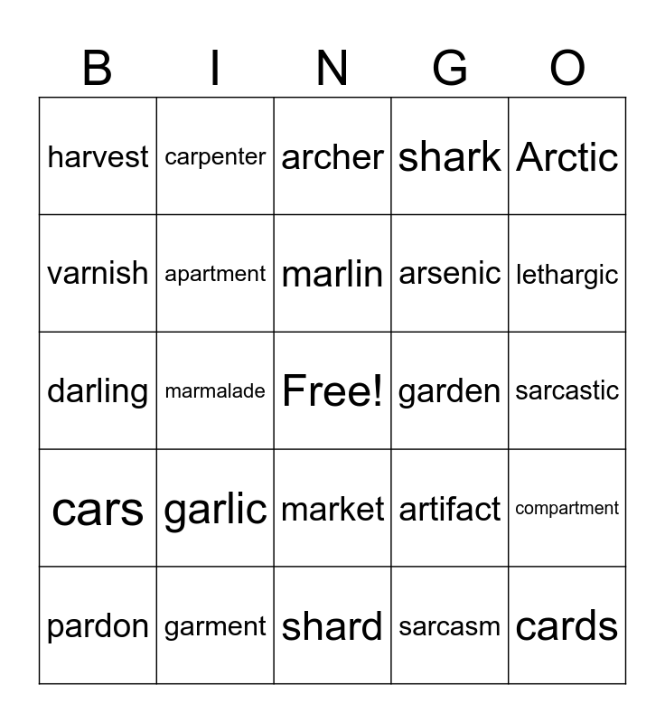 This bingo card has a free space and 24 words: garlic, garment, marlin, pardon, Arctic, harvest, varnish, carpenter, garden, market, arsenic, darling, artifact, compartment, apartment, sarcasm, sarcastic, archer, lethargic, marmalade, cards, cars, shark and shard.