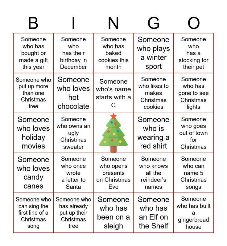 This bingo card has a free space and 24 words: Someone who once wrote a letter to Santa, Someone who has already put up their Christmas tree, Someone who's name starts with a C, Someone who can sing the first line of a Christmas song, Someone who has a stocking for their pet, Someone who has bought or made a gift this year, Someone who put up more than one Christmas tree, Someone who has their birthday in December, Someone who is wearing a red shirt, Someone who opens presents on Christmas Eve, Someone who likes to makes Christmas cookies, Someone who loves holiday movies, Someone who knows all the reindeer's names, Someone who can name 5 Christmas songs, Someone who loves hot chocolate, Someone who has an Elf on the Shelf, Someone who goes out of town for Christmas, Someone who has baked cookies this month, Someone who has gone to see Christmas lights, Someone who owns an ugly Christmas sweater, Someone who has built a gingerbread house, Someone who loves candy canes, Someone who plays a winter sport and Someone who has been on a sleigh.