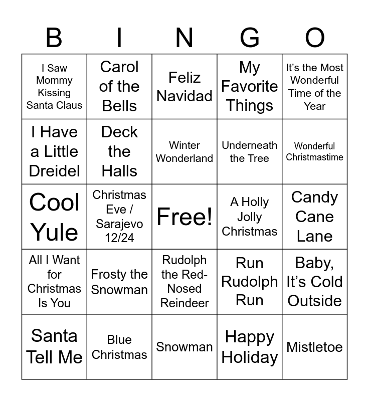 This bingo card has a free space and 37 words: Let It Snow! Let It Snow! Let It Snow!, The Christmas Song, Jingle Bell Rock, Deck the Halls, Baby, It’s Cold Outside, Frosty the Snowman, Winter Wonderland, Sleigh Ride, It’s the Most Wonderful Time of the Year, You’re a Mean One, Mr. Grinch, Christmas Eve / Sarajevo 12/24, My Favorite Things, Mistletoe, Candy Cane Lane, I Have a Little Dreidel, All I Want for Christmas Is You, Last Christmas, Feliz Navidad, Rudolph the Red-Nosed Reindeer, A Holly Jolly Christmas, I Saw Mommy Kissing Santa Claus, Wonderful Christmastime, Santa Tell Me, Snowman, No Place Like Home for the Holidays, Happy Holiday, Carol of the Bells, Hannukah, Oh Hanukkah, Santa Baby, Silver Bells, My Only Wish (This Year), Blue Christmas, Cool Yule, Santa Claus is Comin’ To Town, Run Rudolph Run, Underneath the Tree and This Christmas.