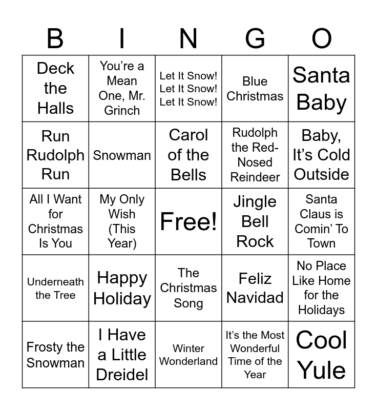 This bingo card has a free space and 37 words: I Saw Mommy Kissing Santa Claus, Wonderful Christmastime, Santa Tell Me, Snowman, No Place Like Home for the Holidays, Happy Holiday, Carol of the Bells, Hannukah, Oh Hanukkah, Santa Baby, Silver Bells, My Only Wish (This Year), Blue Christmas, Cool Yule, Santa Claus is Comin’ To Town, Run Rudolph Run, Underneath the Tree, This Christmas, Let It Snow! Let It Snow! Let It Snow!, The Christmas Song, Jingle Bell Rock, Deck the Halls, Baby, It’s Cold Outside, Frosty the Snowman, Winter Wonderland, Sleigh Ride, It’s the Most Wonderful Time of the Year, You’re a Mean One, Mr. Grinch, Christmas Eve / Sarajevo 12/24, My Favorite Things, Mistletoe, Candy Cane Lane, I Have a Little Dreidel, All I Want for Christmas Is You, Last Christmas, Feliz Navidad, Rudolph the Red-Nosed Reindeer and A Holly Jolly Christmas.