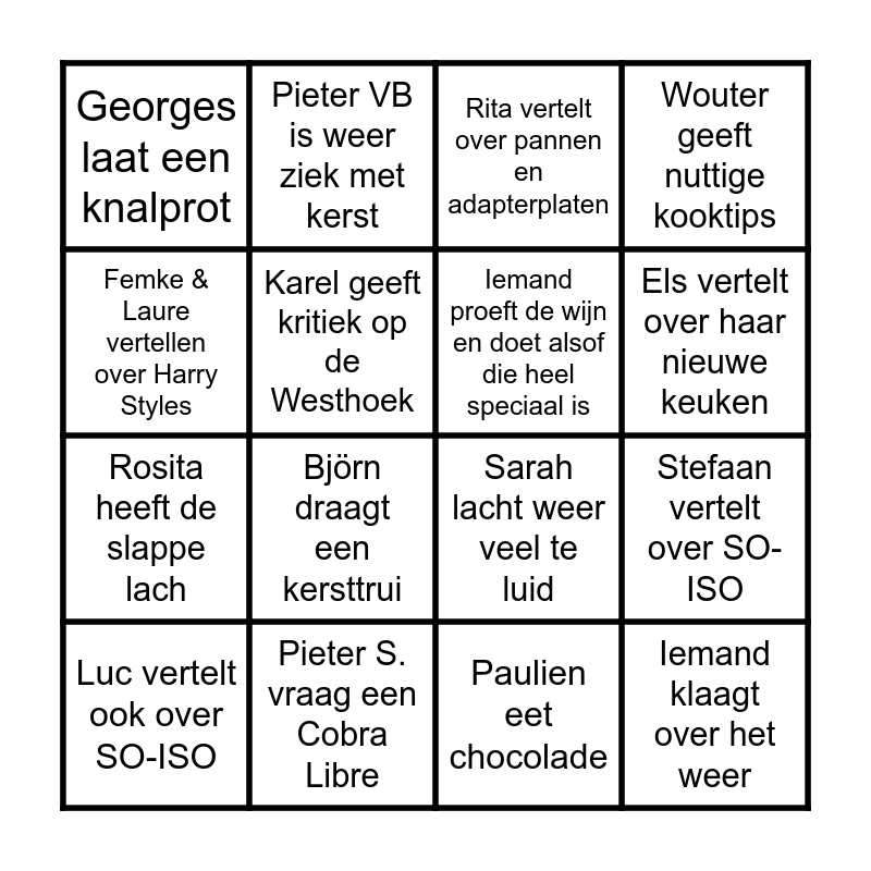 This bingo card has 16 words: Pieter S. vraag een Cobra Libre, Stefaan vertelt over SO-ISO, Rita vertelt over pannen en adapterplaten, Georges laat een knalprot, Rosita heeft de slappe lach, Pieter VB is weer ziek met kerst, Sarah lacht weer veel te luid, Paulien eet chocolade, Femke & Laure vertellen over Harry Styles, Karel geeft kritiek op de Westhoek, Luc vertelt ook over SO-ISO, Wouter geeft nuttige kooktips, Björn draagt een kersttrui, Els vertelt over haar nieuwe keuken, Iemand proeft de wijn en doet alsof die heel speciaal is and Iemand klaagt over het weer.