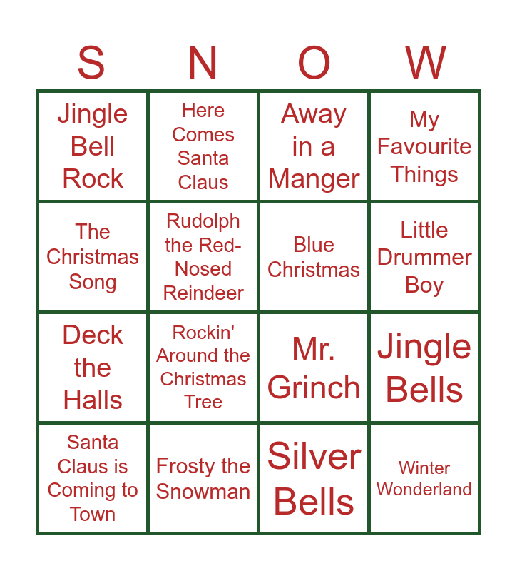 This bingo card has 20 words: Jingle Bells, Marshmallow World, Away in a Manger, Silent Night, Santa Claus is Coming to Town, The Christmas Song, Frosty the Snowman, Jingle Bell Rock, Deck the Halls, Here Comes Santa Claus, Rockin' Around the Christmas Tree, Mr. Grinch, Rudolph the Red-Nosed Reindeer, Winter Wonderland, Blue Christmas, Let it Snow, Little Drummer Boy, My Favourite Things, Silver Bells and We Wish you a Merry Christmas.