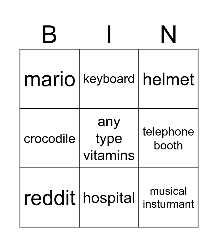 This bingo card has a free space and 8 words: telephone booth, helmet, keyboard, reddit, mario, musical insturmant, crocodile and hospital.