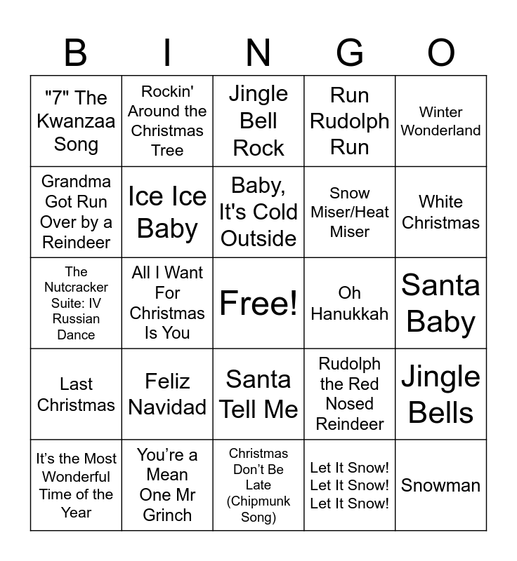 This bingo card has a free space and 29 words: It’s the Most Wonderful Time of the Year, Frosty the Snowman, All I Want For Christmas Is You, Dreidel Dreidel Dreidel, "7" The Kwanzaa Song, Jingle Bell Rock, Ice Ice Baby, Feliz Navidad, Oh Hanukkah, You’re a Mean One Mr Grinch, Santa Baby, Snowman, Christmas Don’t Be Late (Chipmunk Song), Let It Snow! Let It Snow! Let It Snow!, White Christmas, I’ll Be Home for Christmas, Santa Tell Me, Last Christmas, Winter Wonderland, The Nutcracker Suite: IV Russian Dance, Rudolph the Red Nosed Reindeer, Silver Bells, Snow Miser/Heat Miser, Grandma Got Run Over by a Reindeer, Run Rudolph Run, Rockin' Around the Christmas Tree, Jingle Bells, Baby, It's Cold Outside and Deck The Halls.