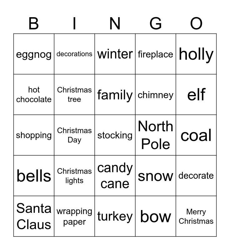 This bingo card has 39 words: gingerbread cookie, ornament, tinsel, Christmas tree, Santa Claus, candy cane, family, mistletoe, holly, bells, Christmas Day, fireplace, stocking, coal, North Pole, Christmas lights, snowman, eggnog, champagne, snow, hot chocolate, turkey, chimney, elf, celebrate, holiday, Merry Christmas, Happy New Year, candle, decorations, Boxing Day, December, winter, wrapping paper, bow, ribbon, decorate, shopping and Christmas card.