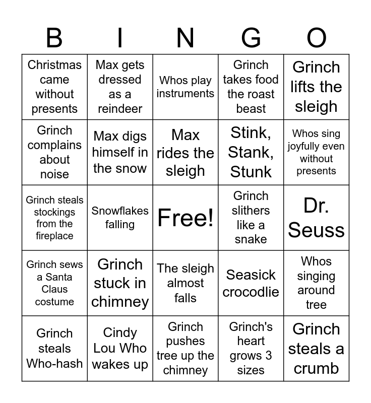 This bingo card has a free space and 28 words: Whos singing around tree, You're a mean one Mr. Grinch, Stink, Stank, Stunk, Grinch's heart grows 3 sizes, Grinch complains about noise, Whos play instruments, Max gets dressed as a reindeer, Grinch sews a Santa Claus costume, Grinch slithers like a snake, Grinch steals Who-hash, Grinch steals stockings from the fireplace, Grinch takes food the roast beast, Cindy Lou Who wakes up, Grinch pushes tree up the chimney, Whos sing joyfully even without presents, Grinch eats with the Whos, Grinch stuck in chimney, Max digs himself in the snow, Max rides the sleigh, The sleigh almost falls, Christmas came without presents, Whoville sign, Grinch steals a crumb, Snowflakes falling, Dr. Seuss, Seasick crocodlie, Grinch lifts the sleigh and Grinch brings back presents.