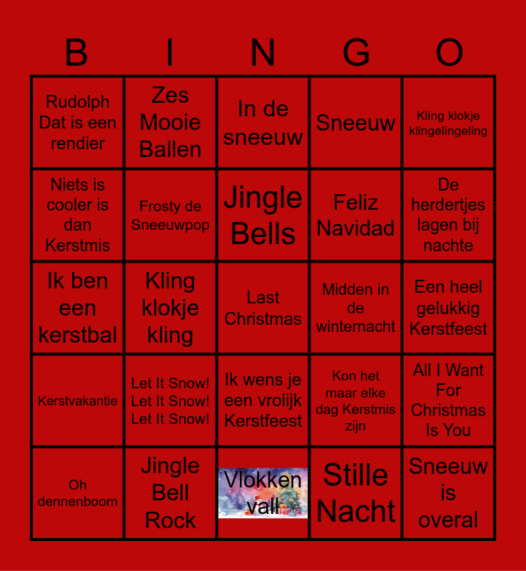 This bingo card has 1 images, a free space and 24 words: Let It Snow! Let It Snow! Let It Snow!, Jingle Bell Rock, Jingle Bells, Oh dennenboom, Kling klokje klingelingeling, Rudolph Dat is een rendier, Niets is cooler is dan Kerstmis, Zes Mooie Ballen, Midden in de winternacht, Ik wens je een vrolijk Kerstfeest, Feliz Navidad, Ik ben een kerstbal, Kon het maar elke dag Kerstmis zijn, All I Want For Christmas Is You, Frosty de Sneeuwpop, Stille Nacht, Een heel gelukkig Kerstfeest, In de sneeuw, De herdertjes lagen bij nachte, Kling klokje kling, Sneeuw is overal, Kerstvakantie, Sneeuw and Vlokken vall.