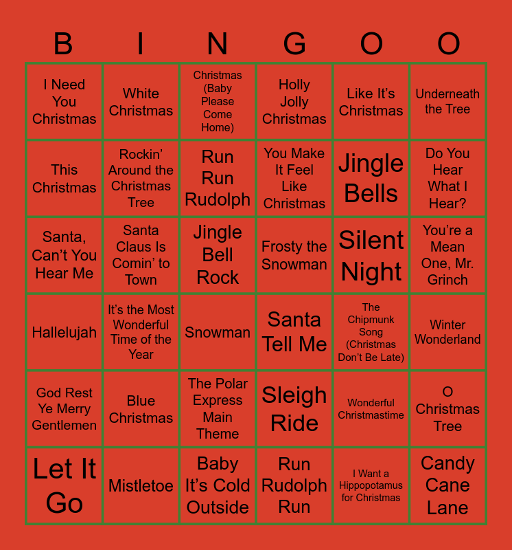 This bingo card has 59 words: All I Want for Christmas Is You, Santa Tell Me, Merry Christmas, Happy Holidays, Frosty the Snowman, Winter Wonderland, Rudolph the Red-Nosed Reindeer, This Christmas, It’s Beginning to Look a Lot Like Christmas, Run Run Rudolph, Let It Snow / Winter Wonderland, Holly Jolly Christmas, Feliz Navidad, Underneath the Tree, Let It Go, Snowflake, I Need You Christmas, Santa, Can’t You Hear Me, Like It’s Christmas, Last Christmas, Rockin’ Around the Christmas Tree, Santa Claus Is Comin’ to Town, Christmas (Baby Please Come Home), Snowman, It’s the Most Wonderful Time of the Year, Carol of the Bells (From Home Alone), Mistletoe, Wonderful Christmastime, Have Yourself a Merry Little Christmas, You Make It Feel Like Christmas, Run Rudolph Run, Mele Kalikimaka, Christmas Tree Farm, Where Are You Christmas?, Deck the Hall, White Christmas, Blue Christmas, Let It Snow! Let It Snow! Let It Snow!, Do You Hear What I Hear?, Baby It’s Cold Outside, Jingle Bells, Santa Baby, Silent Night, Jingle Bell Rock, The Christmas Song (Merry Christmas to You), Sleigh Ride, A Holly Jolly Christmas, Here Comes Santa Claus, Do You Want to Build a Snowman?, You’re a Mean One, Mr. Grinch, The Chipmunk Song (Christmas Don’t Be Late), All I Want for Christmas (Is My Two Front Teeth), Candy Cane Lane, The Polar Express Main Theme, O Christmas Tree, I Want a Hippopotamus for Christmas, Hallelujah, Grandma Got Run Over by a Reindeer, God Rest Ye Merry Gentlemen and Joy to the World.